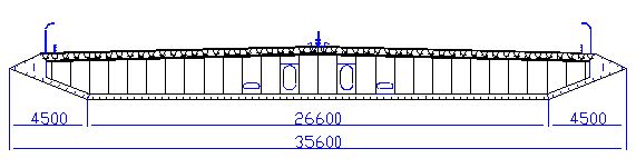加劲梁截面形式为U型加劲肋正交异性板桥面的扁平闭口流线型的单箱单室截面,箱梁全宽(包括风嘴)为35.6m,梁高3.012m,桥面设2%的双向横披。梁的高跨比为1/295,宽跨比1/25。桥面板厚12mm,底板与斜腹板的厚度为10mm。钢箱梁每4m设一道横隔板。虎门大桥悬索桥钢箱梁共划分为39节段,标准段重约300t,采用卷扬机提升跨缆吊机及液压跨缆吊机吊装钢箱梁,节段之间采用全断面焊接连接。