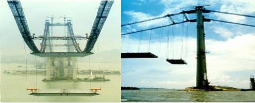 (6)研制出高水平的悬索桥施工专用设备,研制成功特大钢箱梁吊装的液压千斤顶提升式跨缆吊机和紧缆机等