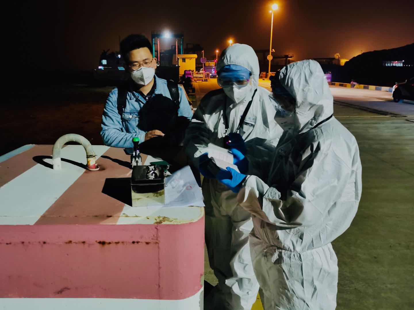 4月26日,边检等口岸查验单位密切配合,按预案启动半潜船32名船员登离轮换班流程,及时对已隔离了14天的17名新登轮中国籍船员进行人证核对,助其上船交接班。
