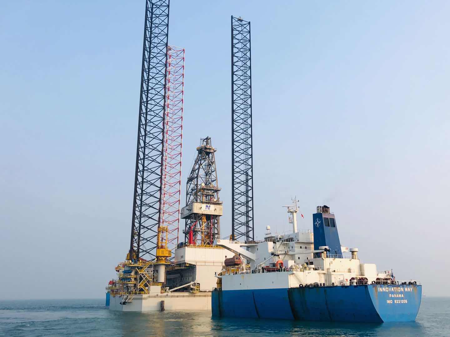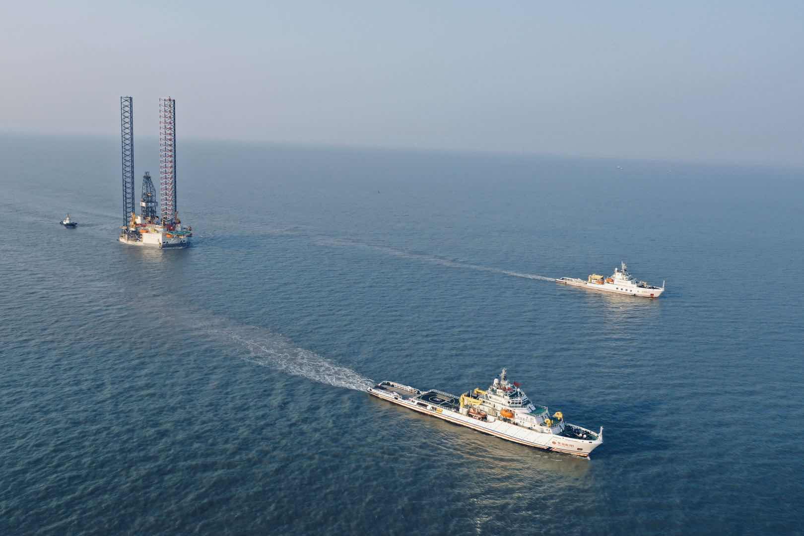 在多方保驾护航下,半潜船上浮将钻井平台顶起,安全完成装载任务。