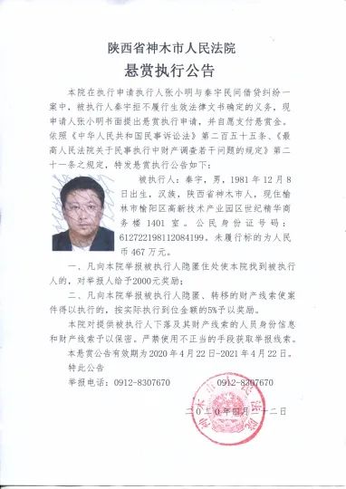 被执行人:秦宇,男,1981年12月8日出生,汉族,陕西省神木市人,现住榆林市榆阳区高新技术产业园区世纪精华商务楼1401室。公民身份证号码:612722198112084199。
