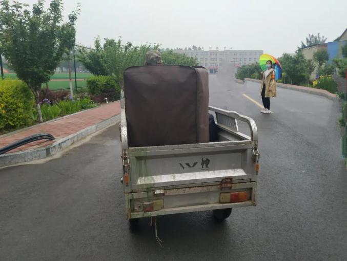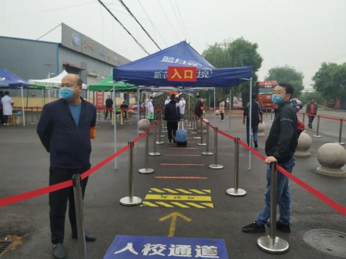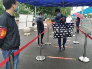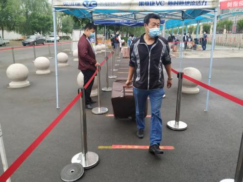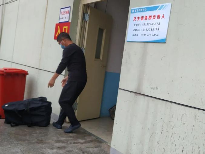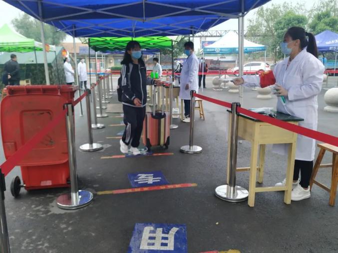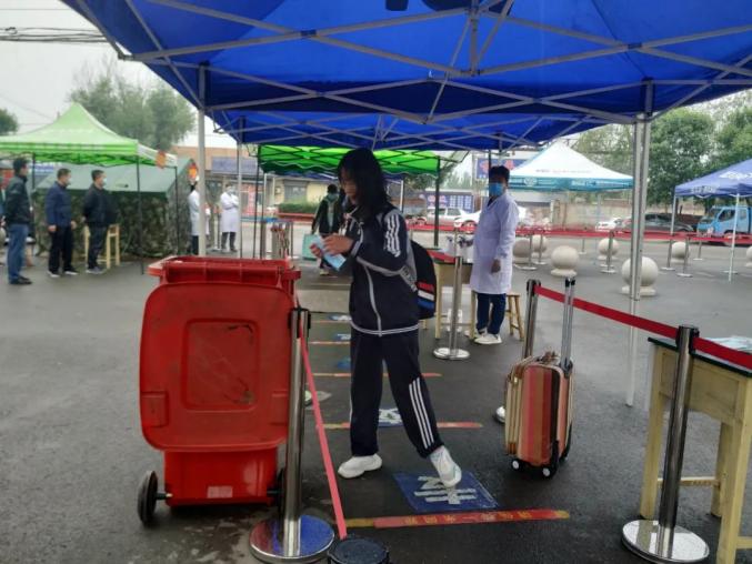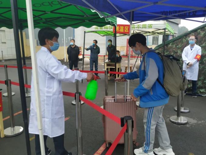 292名学生从7:00-11:00分批错峰复学,每名学生间隔1米以上距离,经过手消毒、鞋消毒、行李消毒、更换口罩,通过红外线体温检测正常后方可入校。