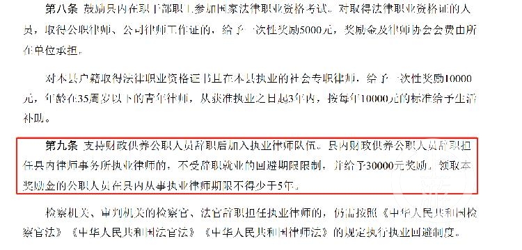 《办法》提出,鼓励县内在职干部职工参加国家法律职业资格考试。对取得法律职业资格证的人员,取得公职律师、公司律师工作证的,给予一次性奖励5000元,支持财政供养公职人员辞职后加入执业律师队伍。县内财政供养公职人员辞职担任县内律师事务所执业律师的,不受辞职就业的回避期限限制,并给予30000元奖励。领取奖励金的公职人员在县内从事执业律师期限不得少于5年。