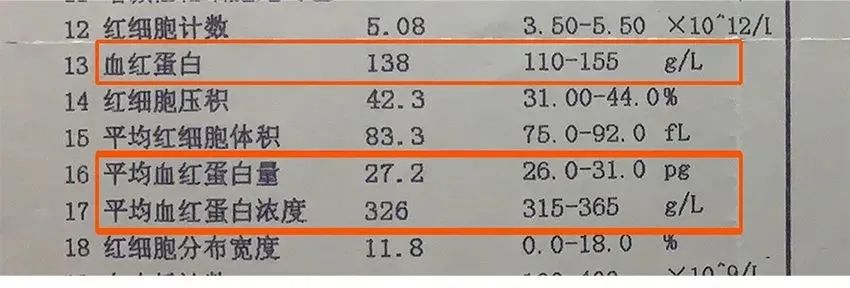 血红蛋白:见上图,血红蛋白有平均血红蛋白含量和平均血红蛋白浓度;