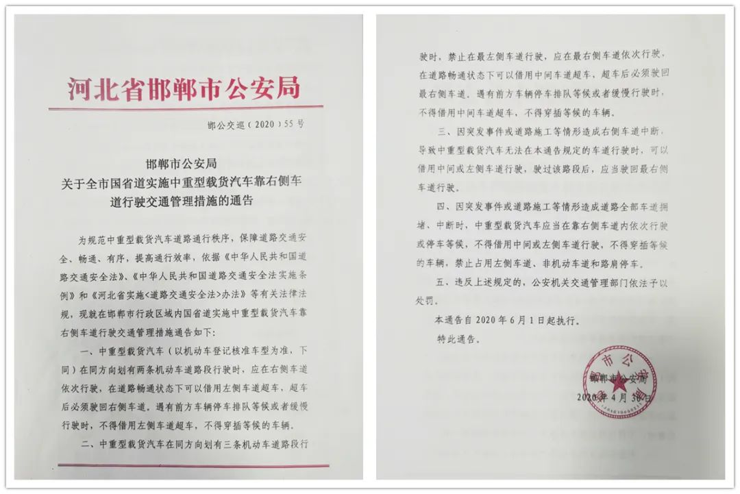 原标题:《邯郸市公安局关于全市国省道实施中重型载货汽车靠右侧车道行驶交通管理措施的通告》