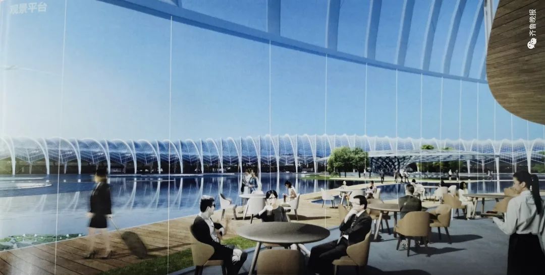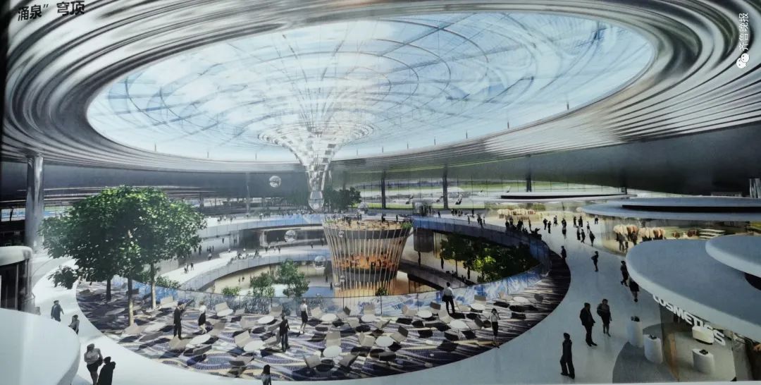 航站区设计以本土设计思想为指导。将山东山水格局和济南地域文化特征提炼为“山、水、泉、荷、林、石”六大要素,通过和航站楼功能有机结合,以建筑、室内、景观一体化的设计语言将这些特征集成。航站楼屋顶起伏舒缓,交通中心(GTC)屋顶水面、航站楼前拱廊、膜结构“涌泉”穹顶、玉石状的酒店,营造出一组生动的泉城意象。