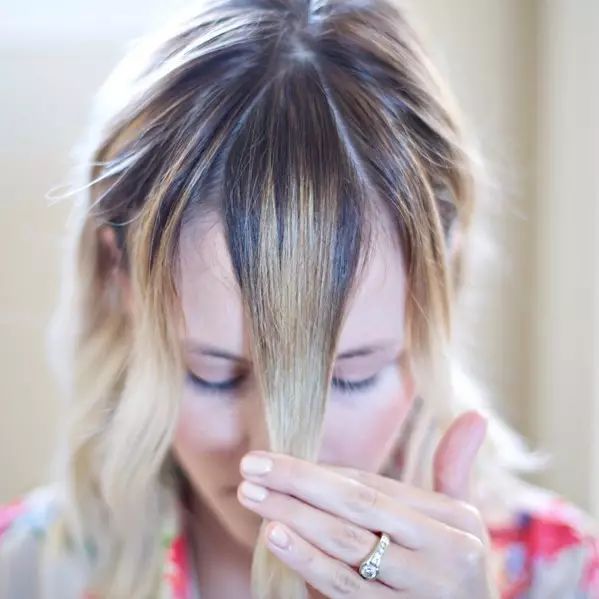 首先想好你的刘海儿要往哪边撩,然后相应地将头发在头顶二八分(八分是有刘海儿的那一侧)——这两步在湿发时更好操作。然后,在八分的那一边,均匀分出一层发量别太多的头发,余下的头发别往脑后,如上图。接下来可以将刘海吹干,方便接下来的修剪。