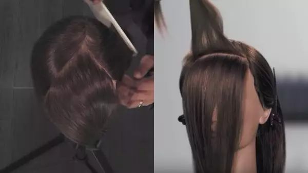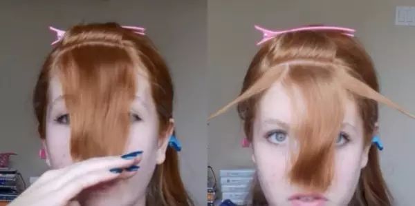 首先,分出较多的头发作为刘海部分往前梳,剩下的头发往后固定好。因为发量多,想一刀平地整个剪过去会导致头发像扫帚一样参差不齐地炸开!可以把刘海区域进行分层,先剪靠里侧的一层,靠外侧的刘海别到头顶后。