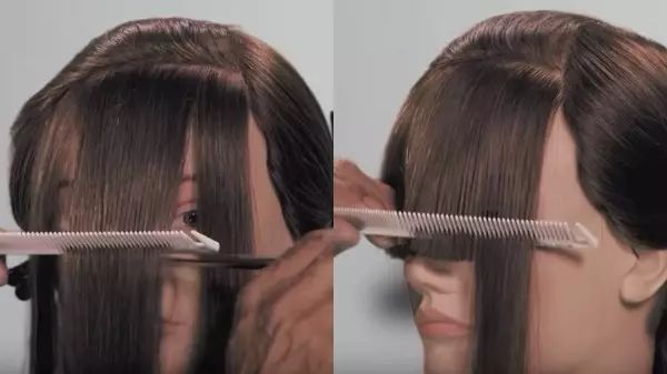 然后小技巧又来了!从边缘处开始剪会比较难估计该剪的位置,而且也容易剪歪,所以我们可以从两眼之间的部分开始下手。如图将刘海分为中间宽两头窄的三部分,梳顺头发,将梳子移到想剪的高度以上一点,将梳子底部作为参照线,顺着剪掉头发。剪完中间部分后,将左右两侧余下的头发分别与中间部分梳在一起,剪成与中部头发一样的长度。