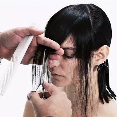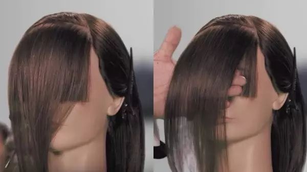 有了剪好的最内层作为参照物,就可以将别在头顶的剩余刘海再次分层,放下来比照着内侧刘海来剪啦~重要提示:有自然弧度的厚刘海,内侧一定是比外侧要短的,所以剪的时候也遵循里层最短,向外逐渐变长的原则。在剪外层刘海时,不要将它与内层贴在一块儿剪成一样长,应该略长与内层。
