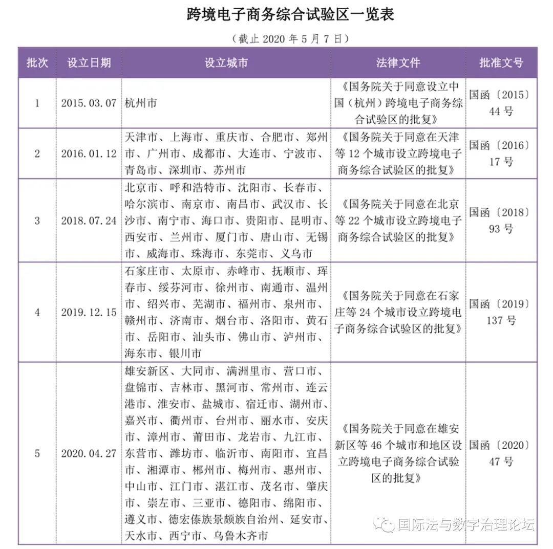 自2015年3月7日国务院公布《国务院关于同意设立中国(杭州)跨境电子商务综合试验区的批复》设立中国(杭州)跨境电子商务综合试验区以来,国家分五批次先后在全国共计105个跨境电子商务综合区。同时,各省人民政府围绕跨境电子商务综合区,积极深化外贸领域“放管服”改革,以跨境电子商务为突破口,大力支持综合试验区大胆探索、创新发展,在物流、仓储、通关等方面进一步简化流程、精简审批,完善通关一体化、信息共享等配套政策,推进包容审慎有效的监管创新,推动国际贸易自由化、便利化和业态创新,取得了一系列成效。
