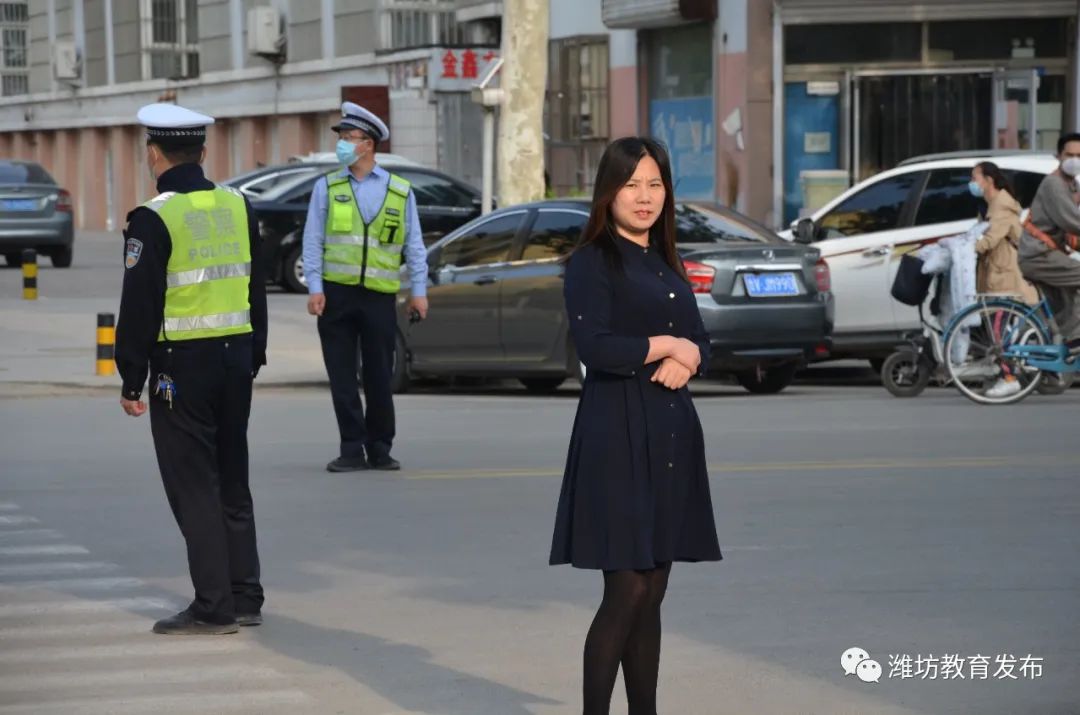 坊子工业发展区实验学校:公安干警进行交通管制,检查入校学生错峰入校时间段信息,维持入校秩序。