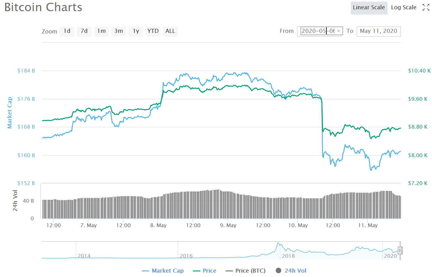 5月11日,截至发稿,比特币价格为8700美元左右。而2天之前,5月8日,比特币价格一度逼近10000美元大关,甚至一些币价网站数据显示已经冲破10000美元。