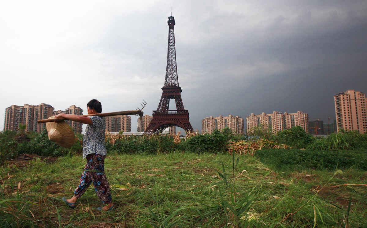 杭州市里的“山寨版”巴黎城内的“埃菲尔铁塔,周围被一片菜地包裹。 资料图