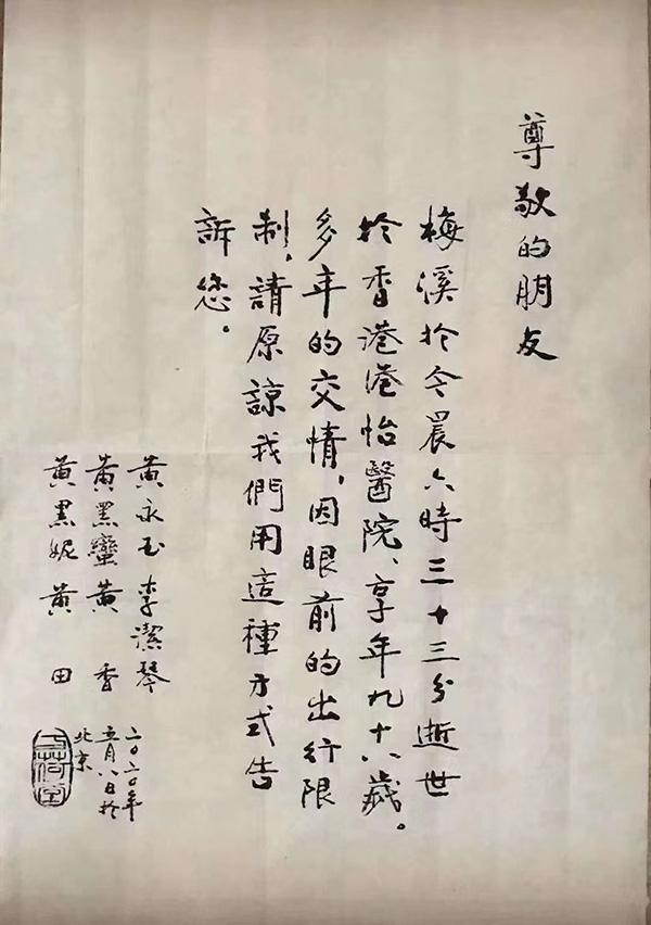 编者按:5月8日,画家黄永玉的夫人张梅溪女士逝世于香港,享年98岁。黄永玉手书讣告:“梅溪于今晨六时三十三分逝世……多年的交情,因眼前的出行限制,请原谅我们用这种方式告诉您。”这份讣告虽然仅5行,却包含了70多年的深情。