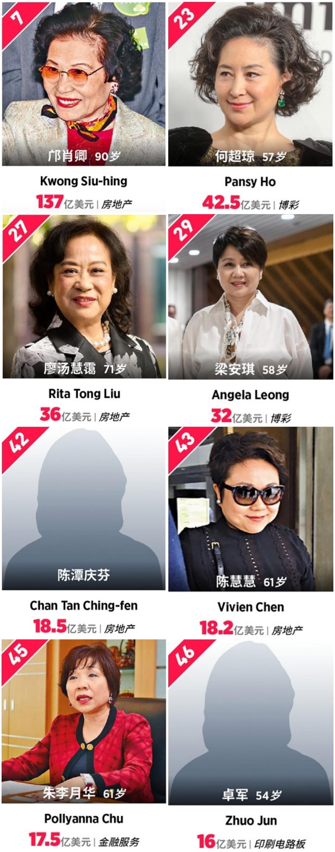 排名女性第一(全榜第七)的邝肖卿是新鸿基地产集团创始人郭得胜的夫人,郭炳湘、郭炳江和郭炳联三兄弟的母亲。