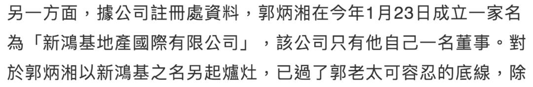 ▲ 其实事件的导火索是郭炳湘注册了一家同名公司,试图另起炉灶,这简直是触碰了母亲作为一家之主的底线。集团一方面宣布他休假,一方面还在给他机会回头是岸。
