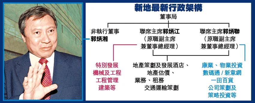 5月27日,新地正式罢免了郭炳湘的主席和行政总裁一职,由母亲邝肖卿接任主席。