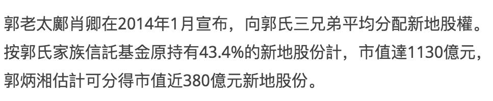 事实上,2010年因为家族风波,郭老太第一次分割财产,把43%的股权分为三份,郭炳江和郭炳联两兄弟和家人各三分之一,而郭炳湘的那部分由家人继承,他自己只拿到了200亿。