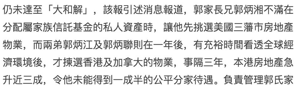 ▲ 另一边郭炳湘还是没有消停,2017年他上告英国法庭要求重新分产,原因竟然是自己选早了所以选亏了。完全验证了一句话,“用眼角偷瞄对方是否比自己幸运是人之常情,如果是亲兄弟,那更要看个究竟。”