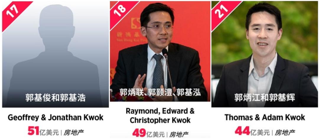 ▲ 虽然经历家族分产、牢狱之灾,新地整个元气大伤。但除了郭老太自己的137亿美金资产外,郭家子孙们在榜单上依旧独占三席,是名副其实的香江豪门。(插播一句,郭炳联的儿子郭基泓的太太是中传毕业的前凤凰卫视主持人赵情晴,他们的故事我们下回细聊)
