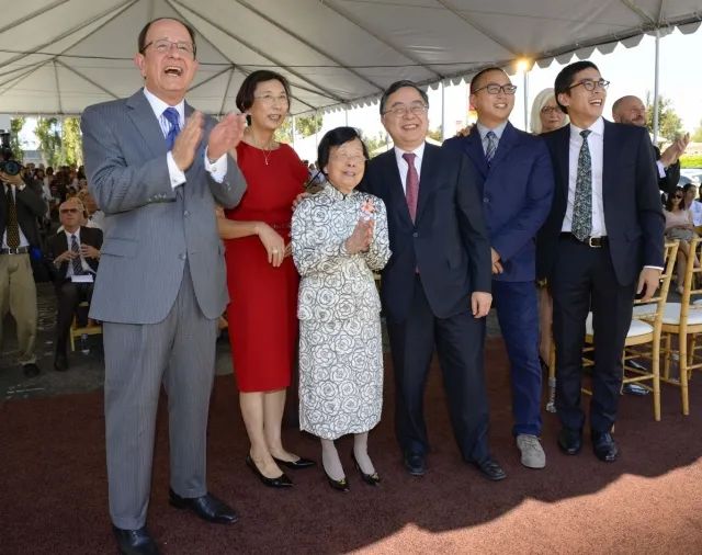 ▲ 捐完哈佛,陈启宗又和太太(左二)带着母亲去了母校南加州大学,这也是他两个儿子(最右)的母校。陈老太换了一身中式套装,依旧没有过多装饰。他们捐了2000万美金并且以母亲陈曾熙夫人命名了职能科学与职能治疗学部,小儿子陈文扬(右二)毕业后在此担任助理教授。