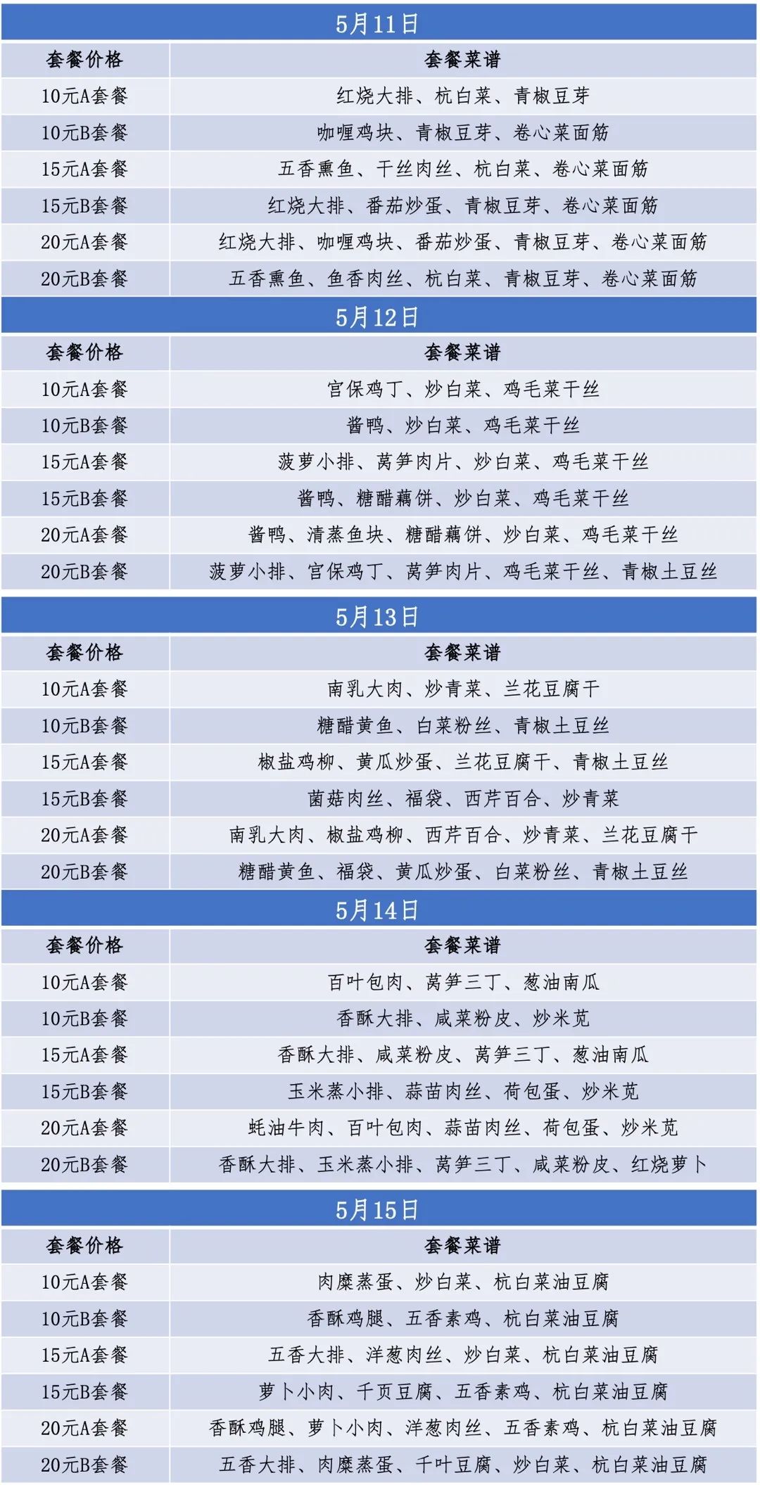 现阶段,食堂每日午晚餐提供10元、15元、20元三种价格套餐供师生选择,两校区具体菜单如下: