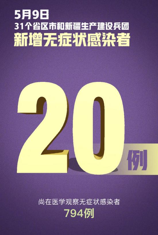 1.截至5月9日24时新型冠状病毒肺炎疫情最新情况:5月9日0—24时,31个省(自治区、直辖市)和新疆生产建设兵团报告新增确诊病例14例,其中12例为本土病例(吉林11例,湖北1例);新增无症状感染者20例(境外输入1例)。(国家卫健委网站)