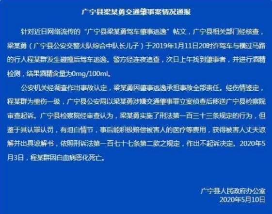 6.官方通报“广东肇庆广宁县交警队长儿子肇事逃逸未被起诉”:经查,梁某勇(广宁县公安交警大队综合中队长儿子)于去年1月11日驾车与行人程某群发生碰撞后逃逸。公安机关认定,梁某勇承担事故全责。检方经审查认为,鉴于梁某勇认罪认罚,有坦白情节,事后积极赔偿被害人医疗等费用,获得被害人丈夫谅解并出具谅解书,遂作出不起诉决定。今年5月3日,程某群因白血病恶化死亡。(中国新闻网)