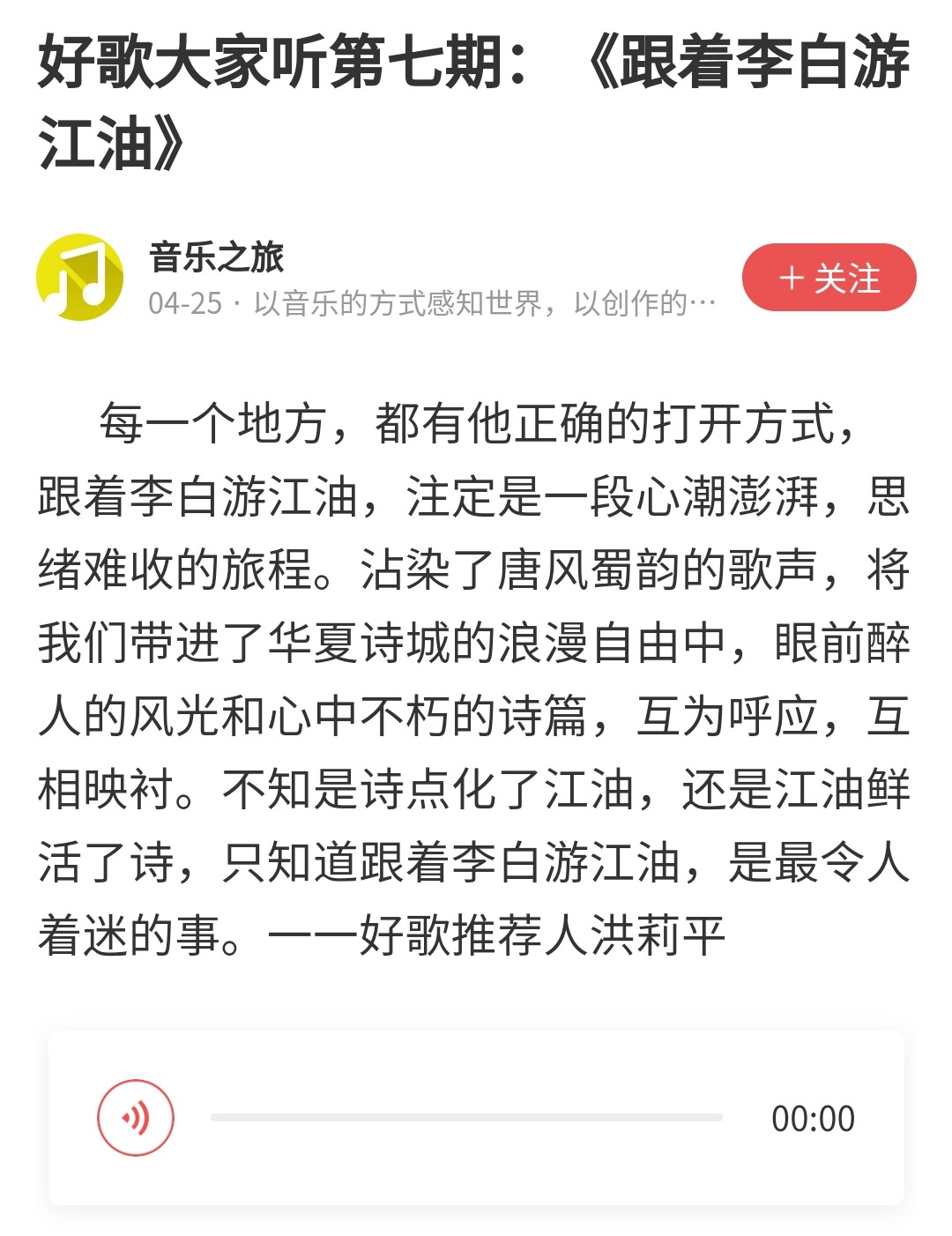 日前,由江油市文广旅局策划、江油市文化馆组织创作的2019“一带一路”李白文化节主题歌曲《跟着李白游江油》,被人民日报客户端好歌大家听栏目推选为第七期优秀歌曲。