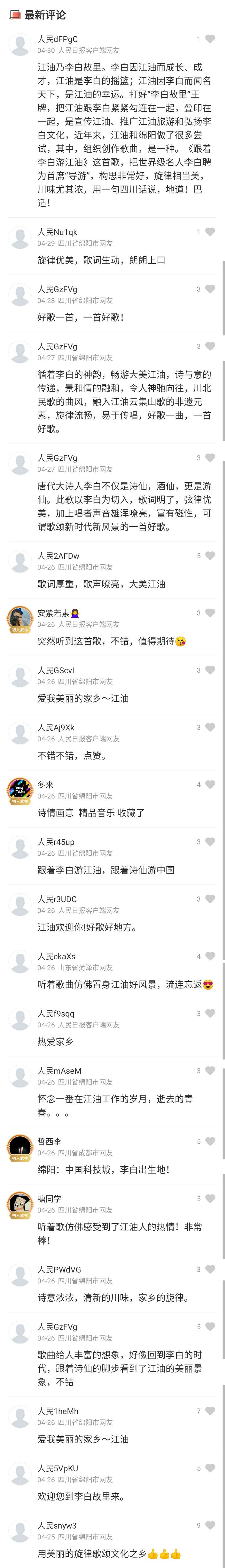 杨海英:反复听了几次,听第一遍的时候,很有四川的感觉。听第二遍的时候,我认真看了歌词,词很美,再配上唐永建老师的曲子,我仿佛看见了江油秀丽的山河风景。听第三遍的时候,觉得节奏很轻快,听起来让人心情无限好,非常赞的作品,为我们绵阳人点赞,期待唐永建老师更多的优秀作品。