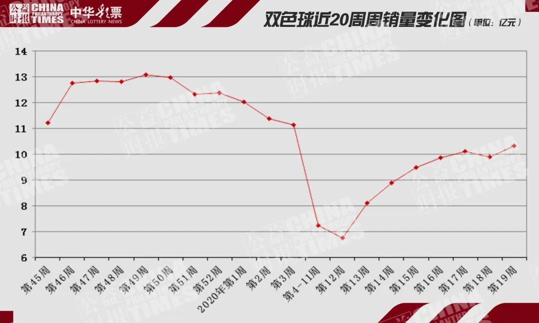 在第19周,双色球销量的稳定助推了奖池的增加。这一周双色球期销量稳定在3亿元水平之上,这也是双色球期销量自复市后连续14期保持在3亿元的水平。并且,双色球在第2020035期销量达到了3.71亿元,这也是今年复市以来双色球的最高期销量。