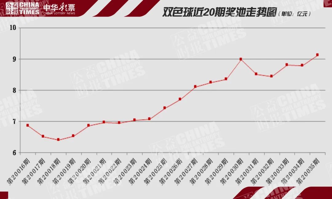 第19周,双色球奖池稳步增长,并最终突破9亿元档。这也是自今年1月12日第2020005期双色球开奖以来,在时隔4个月后双色球奖池再破9亿元。