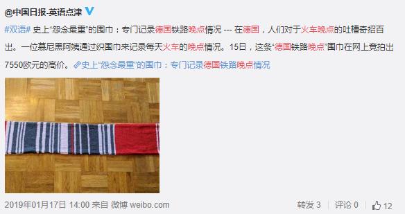 因为她上下班火车经常晚点,于是用不同颜色记录下了晚点情况,结果这条“德国铁路晚点围巾”在网上竞拍出了7550欧元高价。