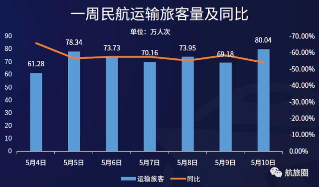 据交通运输部,5月10日中国民航运输旅客80.04万人次,成为102天以来首次突破80万人次。