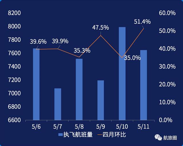 据航班管家数据,五一小长假期间国内航班日均执飞率47.6%,假期过后(5月6日-11日)日航班执飞率维持在50%以上,日执飞航班量环比4月均增长35%以上,中国民航市场逐渐摆脱假期潮汐效应。