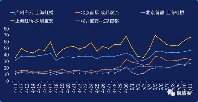 自4月30日0时起北京下调突发公共卫生事件应急响应级别后,北京-上海、北京-成都、深圳-北京等商务航线航班量在工作日均有不同程度的增长,其中北京-上海航线增加趋势明显。