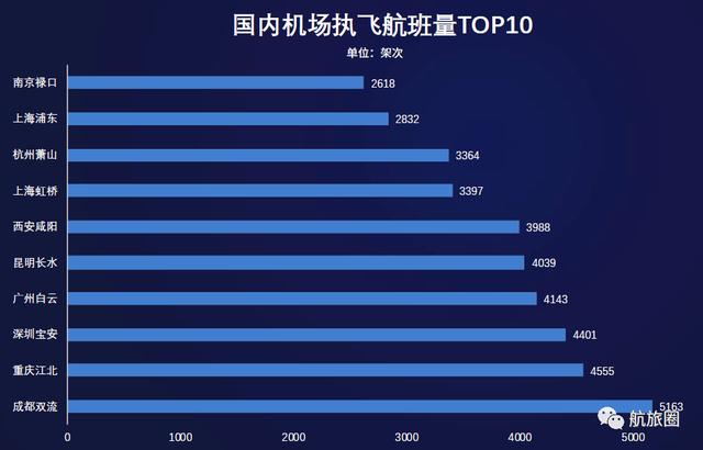 航班管家公布的上周(5月4日-10日)国内机场航班量排名也显示成都、重庆、深圳市场火爆。相比4月的情况,成都依然保持第一,重庆超越深圳排名第二,上海浦东取代郑州位列第九,其他机场排名未发生改变。