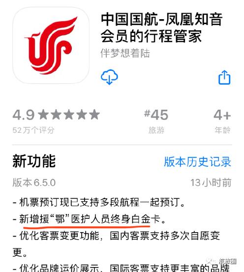 国航也在新版本APP上增加了送给援鄂医护人员的终身白金卡。在此之前,厦航、春秋等航司也向国内医护人员赠送了会员权益,吉祥航空向援鄂医护人员送出终身金卡权益和3套国内国际机票。