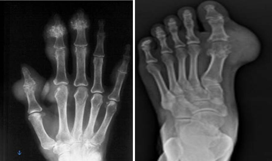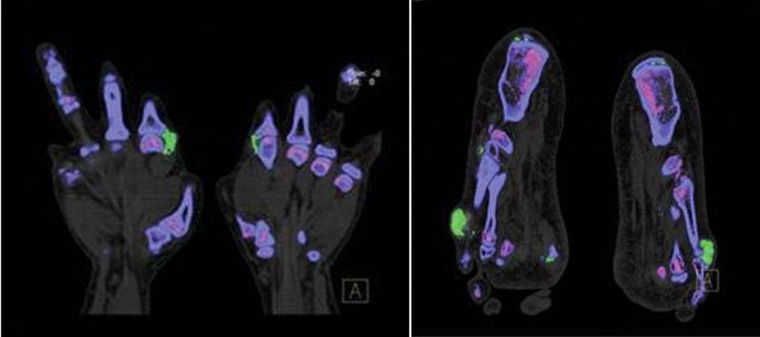 双腕、手及双足部分关节周围可见软组织不对称结节肿胀,密度稍增高;部分关节面下及边缘见部分囊状、穿凿样骨质破坏。