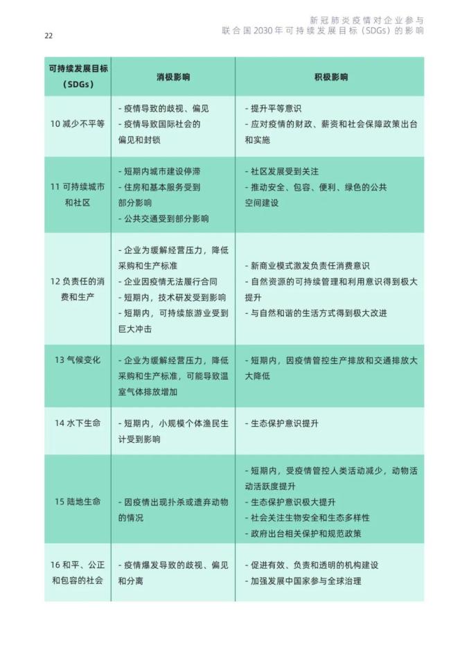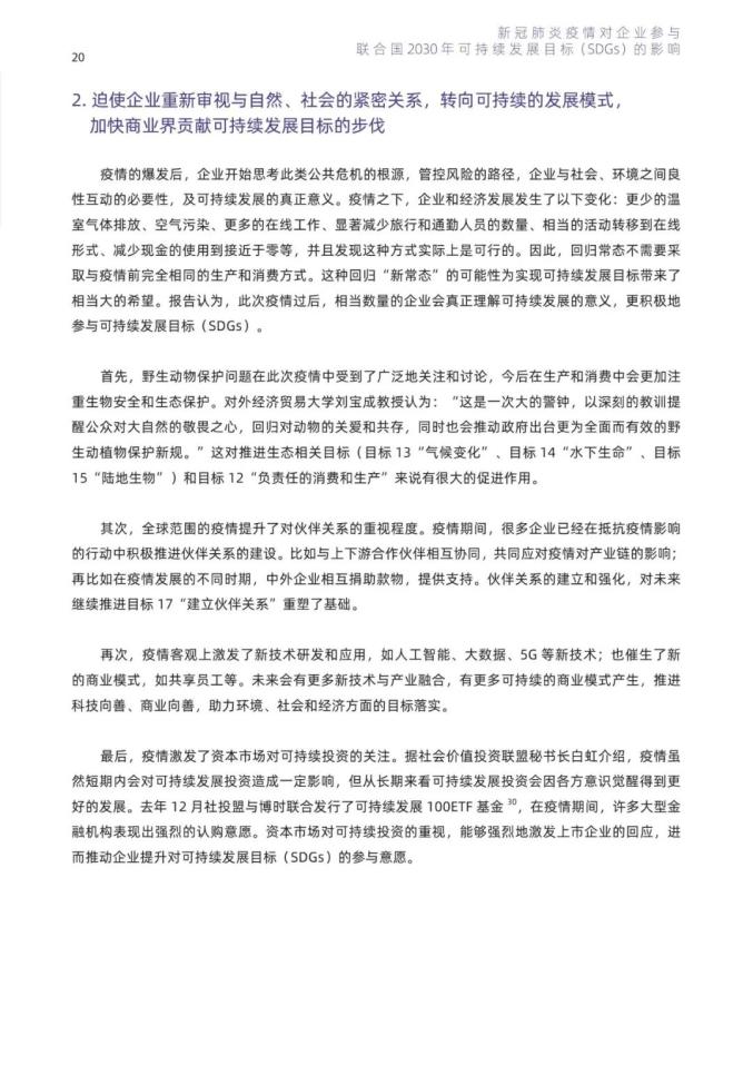 疫情在短期内可能会对企业参与落实联合国2030 年可持续发展目标带来负面影响。同时,疫情也可能推动企业重新审视与自然和社会的关系,促进包括企业、资本市场、消费者、政府等在内的多方更重视可持续发展模式。