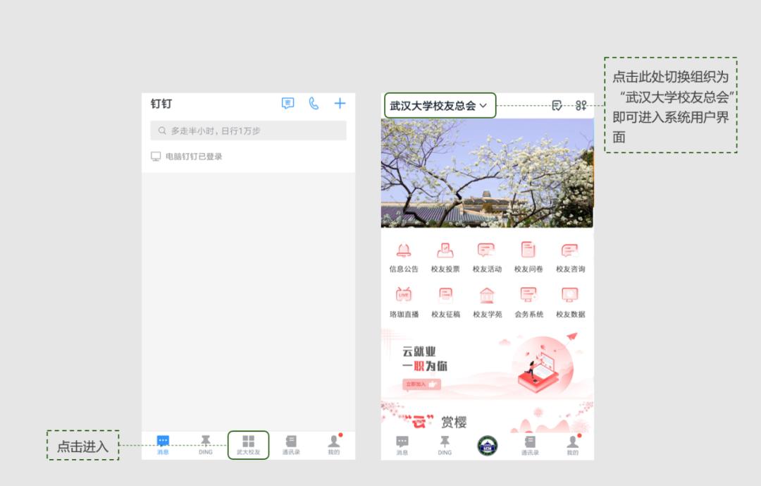 下载钉钉APP,用身份认证时使用的电话号码登录,点击页面下方工作台,选择“武汉大学校友总会”组织进入武汉大学校友信息系统。
