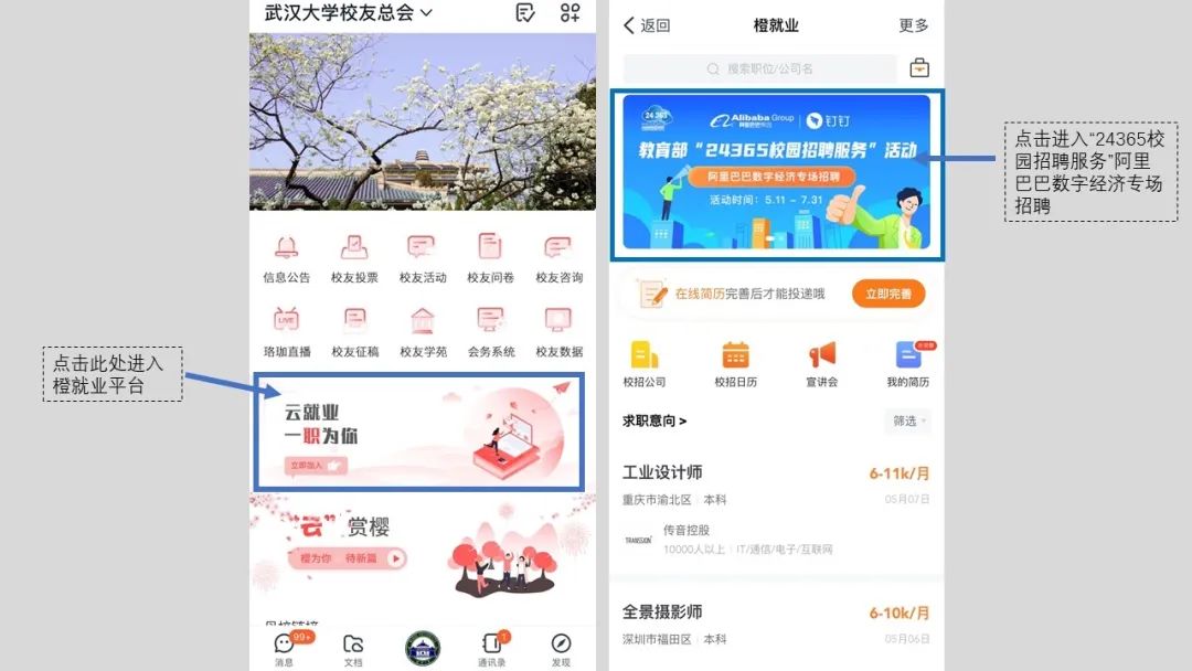 通过校友信息系统首页“云就业,一职为你”进入橙就业平台直接求职,也可点击页面上方banner画面进入“24365校园招聘服务”阿里巴巴数字经济招聘专场寻找更多招聘信息。
