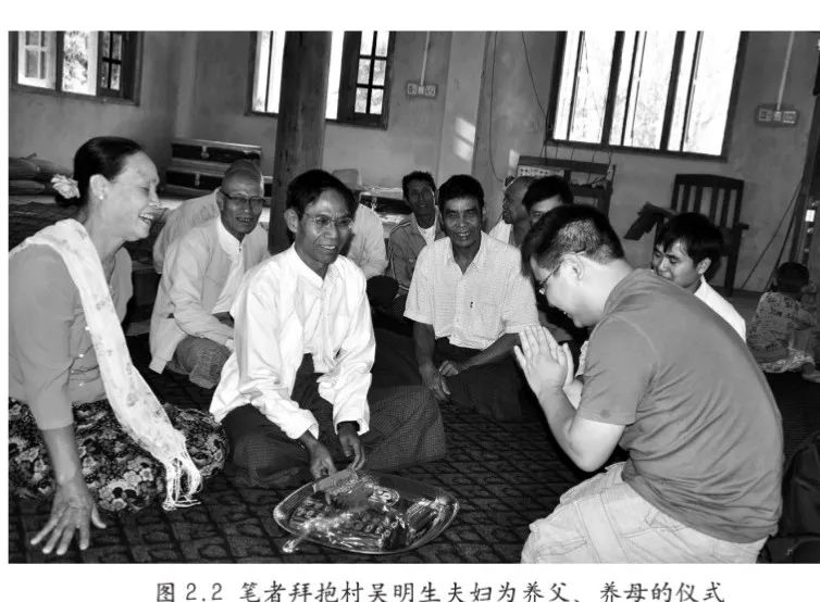 在举行剃度仪式之前,村民还建议我在村里找一对夫妇作为自己的养父养母,养父母可以帮我承担一部分剃度仪式的花销,剃度仪式所产生的功德也能得到分享,这是缅人剃度文化的重要传统。就这样,我仿照了摩尔根进入易洛魁人部落的方式,通过仪式成为了抱村村民吴明生夫妇的养子。吴明生60岁,是抱村的头人,在村落中享有极高的威望。吴明生夫妇一共有6个子女(3儿3女),我就是在这样的契机下嵌入到了一个缅族大家庭之中。