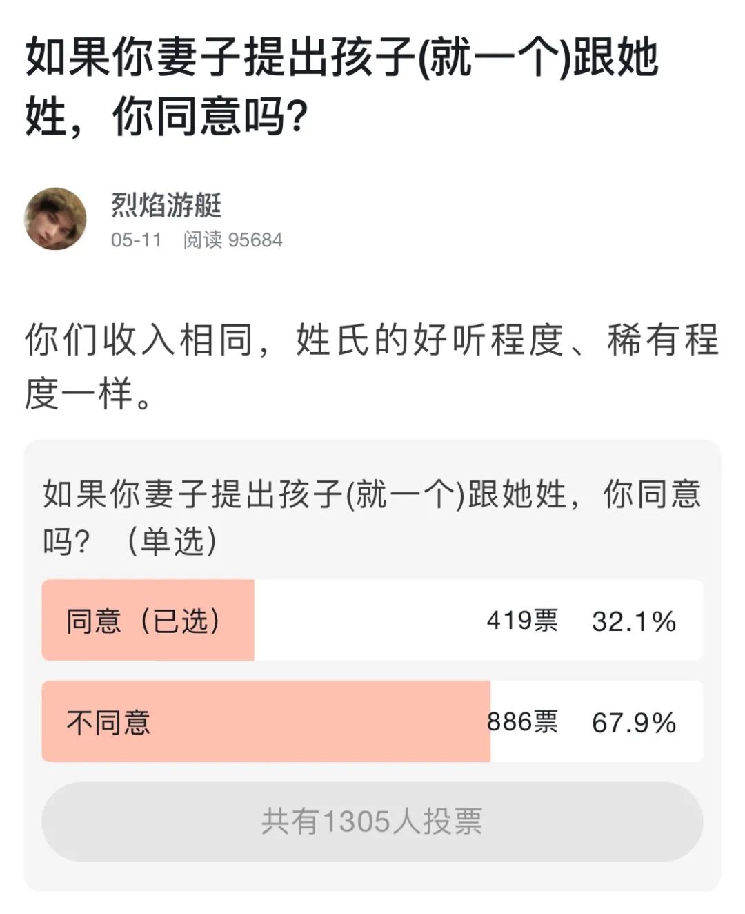 有人提出:“如果你的妻子提出孩子(就一个)跟她姓,你同意吗?”在1300多名投票者中,有将近七成的男性选择了“不同意”。