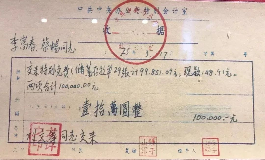 另一张写着:“1975年3月17日,李富春、蔡畅同志交来特别党费10万元整(其中储蓄存款单29张计99851.09元,现款148.91元)”。