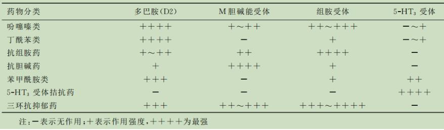 常用止吐药可作用于皮层、呕吐中枢、呕吐化学触发带或内脏传入神经的一个或多个环节等。各类止吐药的受体亲和力见下表1: