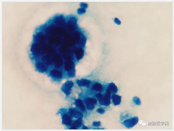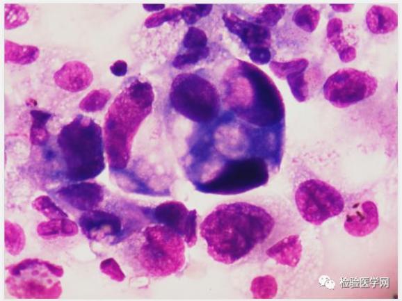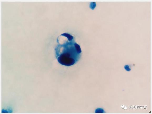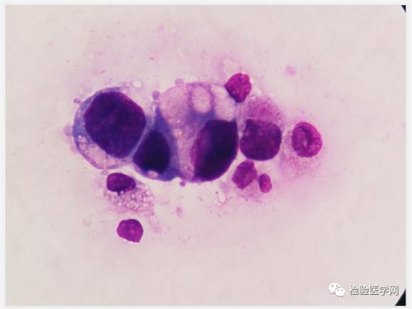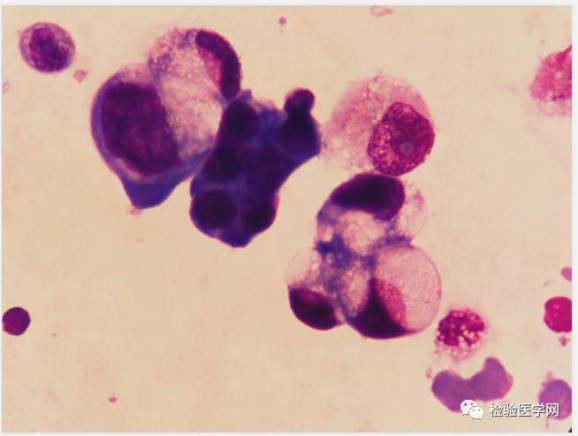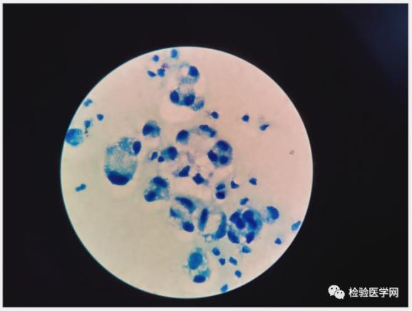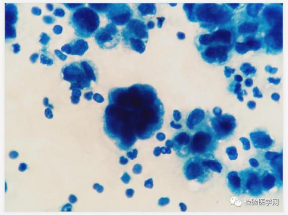 瑞吉染镜检可见成堆或散在的异常细胞,该类细胞,胞体增大,不规则,核大,圆形或类圆形,染色质疏松,胞浆量丰富(云雾状或泡沫样改变),深蓝色。根据吴茅老师的“三大畸形”理论,高度可疑“肿瘤”细胞。