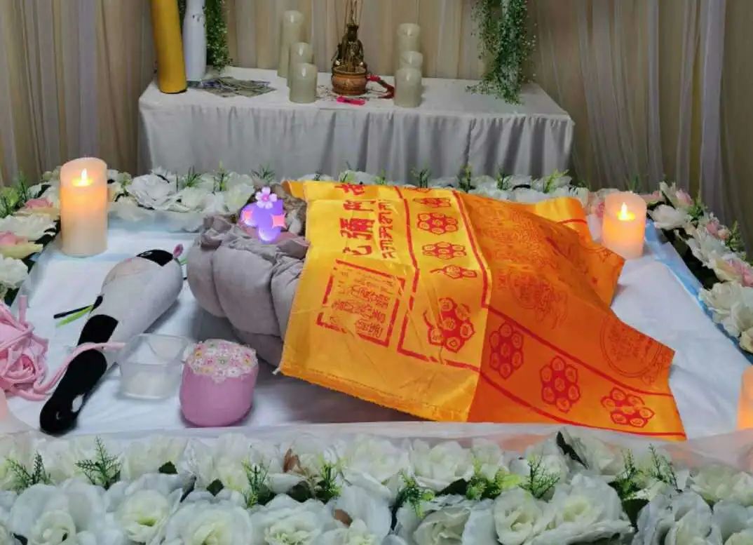 整理完毕,师傅像对待婴儿般将秋秋抱进了告别厅,轻轻放在铺有鲜花的台面上,为她盖上了往生经文被。秋秋安静地和她生前爱玩的玩具躺在一起,似乎只是睡着了。随后,夏师傅亮起六只电子蜡烛,在一旁用手机为叶梅和秋秋拍照:“如果客人需要的告别时间比较久,我会暂时走开,去准备下一流程的工作。把时间交给他们,完成今生缘分的告别。”