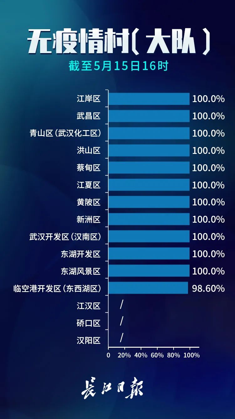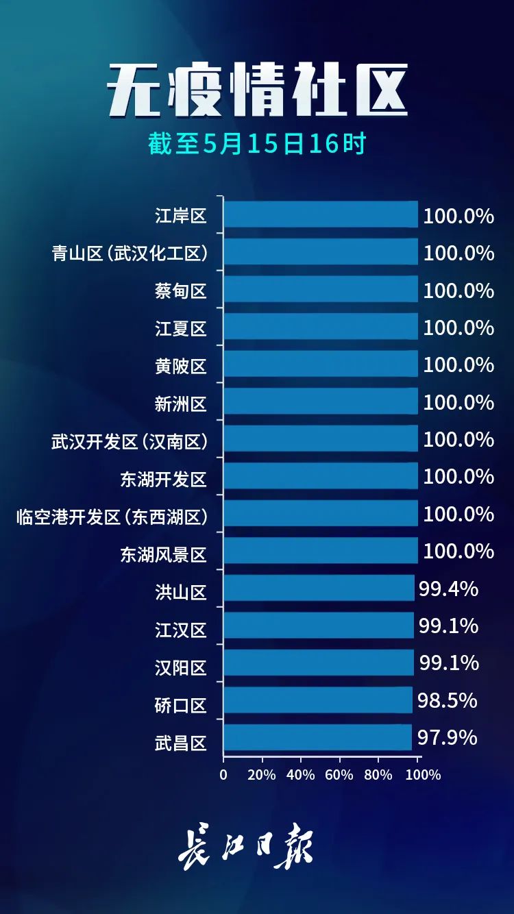 截至5月15日16时,武汉市无疫情小区累计7095个,占比99.9%;无疫情社区累计1398个,占比99.4%;无疫情村(大队)累计1942个,占比99.9%。命名第十六批无疫情街道(乡镇)11个;进入公示环节的第十七批无疫情街道(乡镇)申报单位3个;新增加的第十八批无疫情街道(乡镇)申报单位4个。全市无疫情街道(乡镇)累计136个,占比78.6%。因无症状感染者转为确诊病例,取消东西湖区长青街及三民大队、三民小区的无疫情命名。
